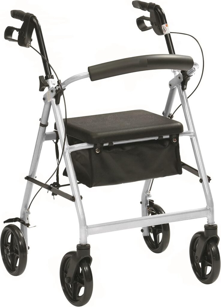 4 wheels, seat, adjustable height, hand brakes, foldable